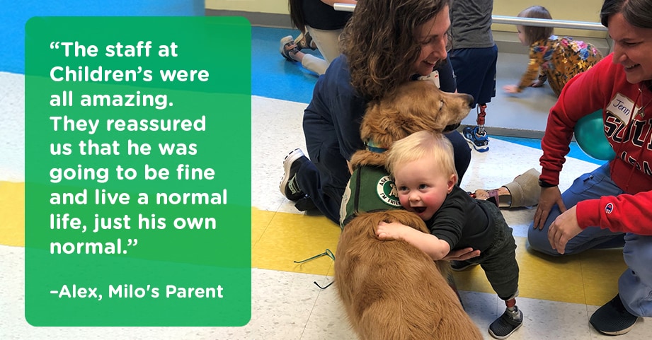 After meeting Allis, a facility dog at Children's serving our orthotics and prosthetic patients, during one of his therapy appointments, the pair built an unbreakable bond. In an effort to encourage mobility, Allis and her handler worked alongside Milo’s therapists to serve as a source of motivation. Allis was more than up for the challenge—excited by the prospect of petting his furry friend, Milo practiced walk using his prosthetic legs.“Milo is amazing,” said Alex. “He never missed a milestone. He was early on crawling, sitting, rolling, all that. He was pretty on time with everything. He loves anytime we get to see Allis during our visits to Children’s.”